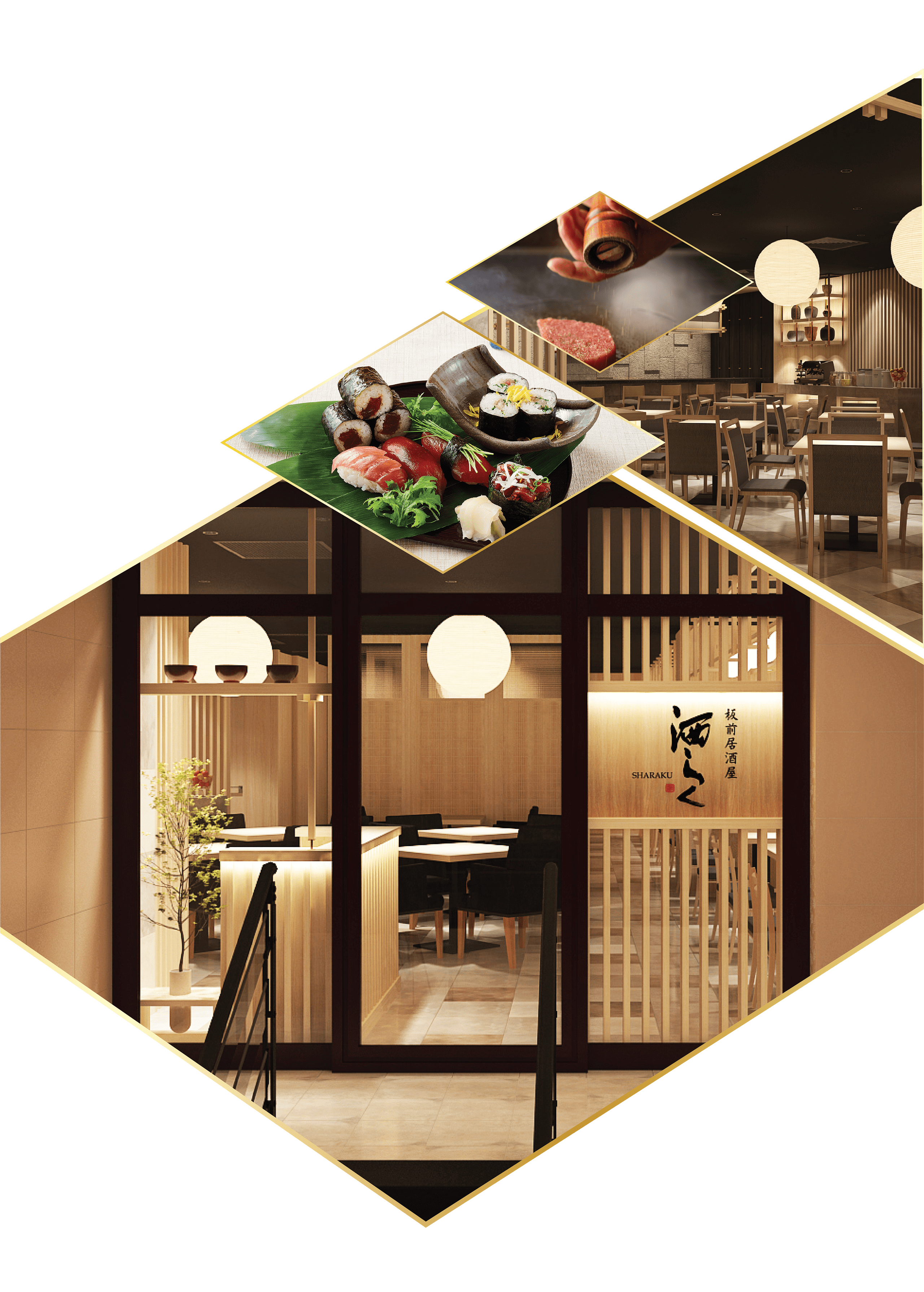 「寿司」、「鉄板焼」、「天ぷら」の専門店が集合した板前居酒屋・洒らく(しゃ らく)