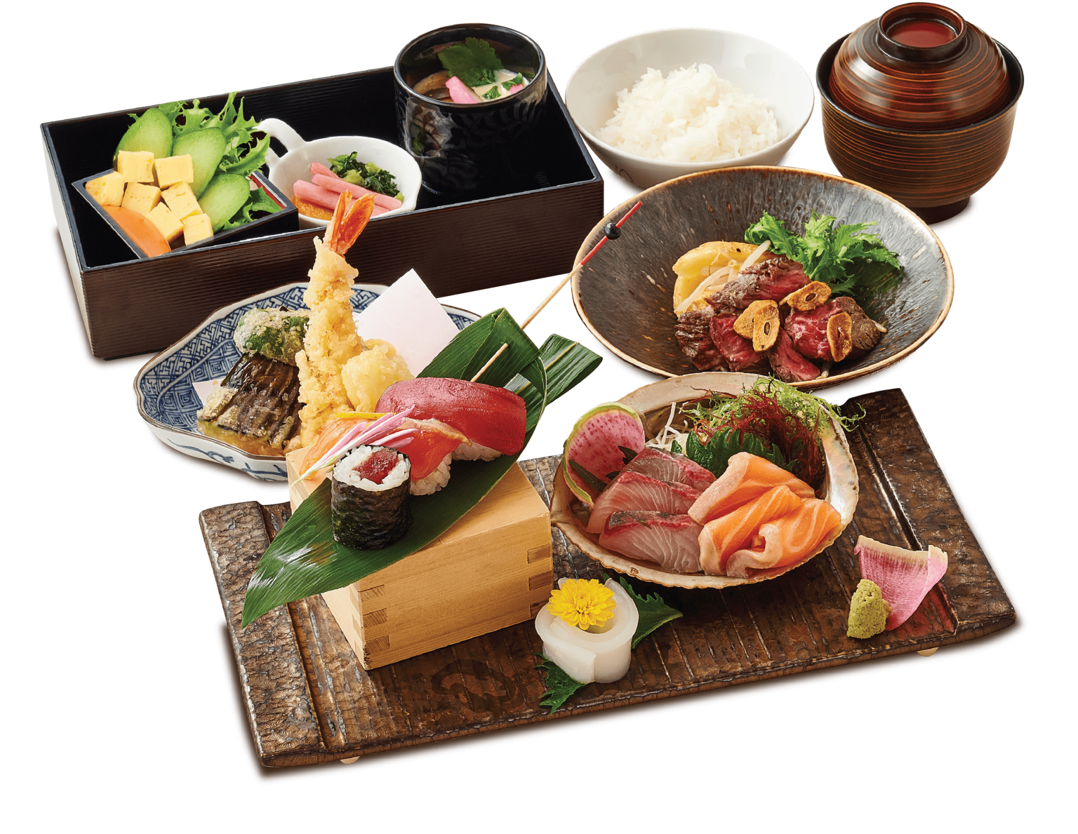 寿司、鉄板焼き、天ぷら、それぞれのカウンター席と、間仕切りのある半個室、窓側のソファー席など、 さまざまなシーンに合わせてお席をお選びいただけます。